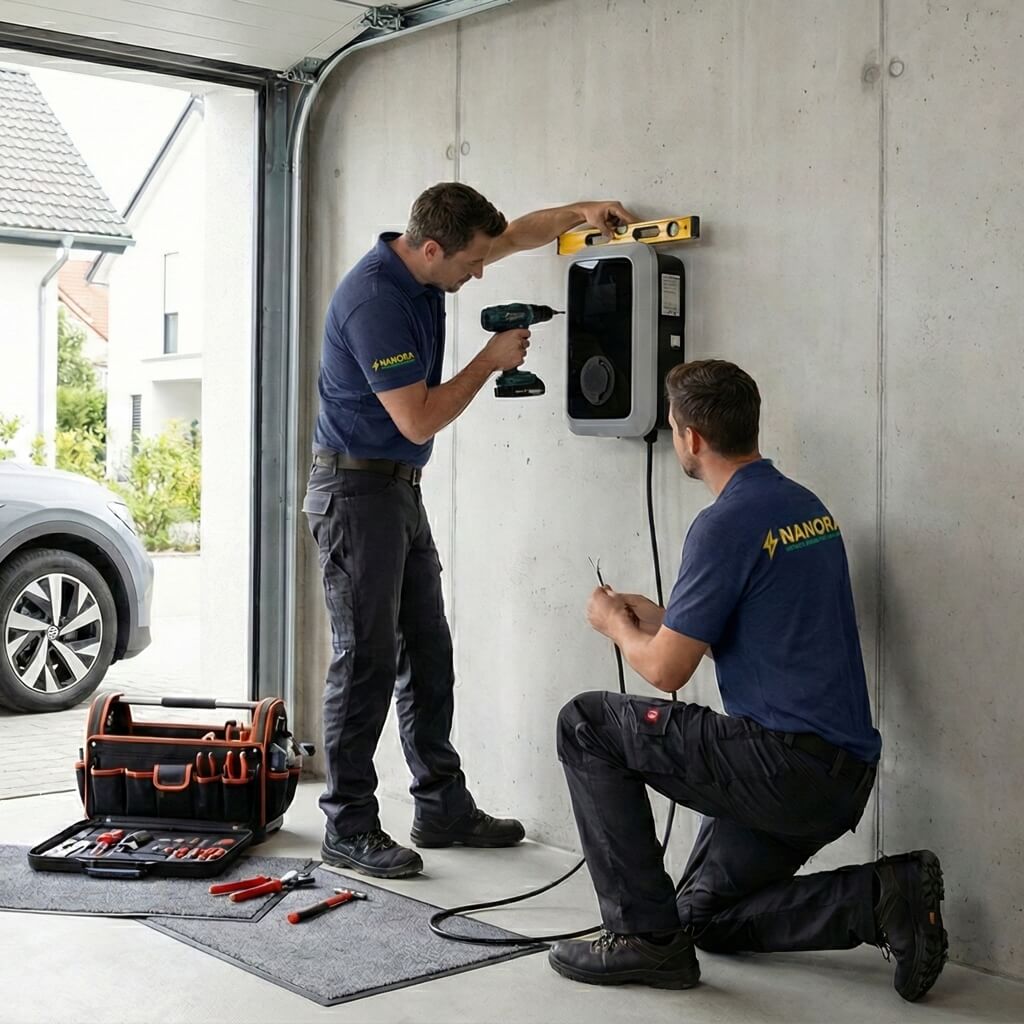 Bij Nanora Laadpalen verzorgen wij de volledige installatie van uw laadpaal. Van voorbereiding en advies tot een veilige, vakkundige plaatsing volgens de geldende normen.